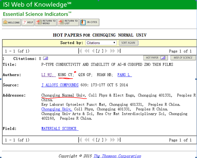 为第一单位于2014年发表在《JOURNALOF ALLOYS AND COMPOUNDS》上的学术论文《P TYPECONDUCTIVITY AND STABILITY OF AG-N CODOPED ZNO THIN FILMS》入选ESI热点论文(ESIHot Papers),标志奈飞工厂