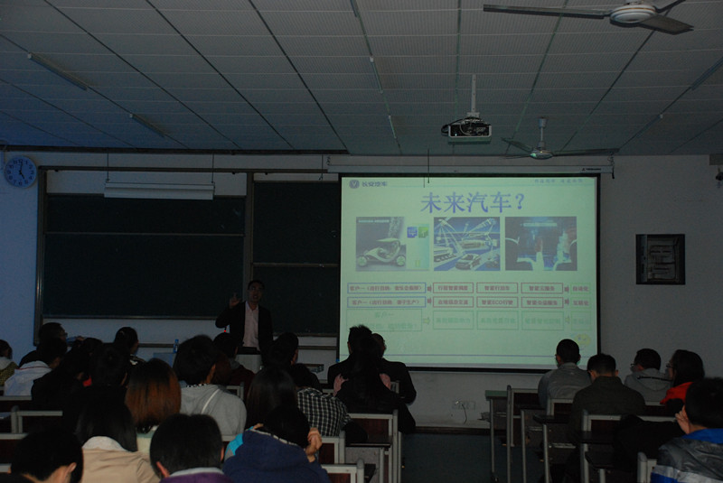 校友李旭博士围绕主题阐述了长安集团的尖端科技——“汽车的绿色化探索与抗电磁干扰成果”,现场同学们被带进一个神奇的电子技术世界,都专注地聆听着他的介绍。李博士还向同学们介绍了汽车的发展前。他以汽车行业未来“三大化”的宏伟蓝图引申电子信息专业知识的学习、研究,让同学们有所思、有所想、有所收获。王文玺博士则追根溯源,向同学们介绍长安集团的汽车生产史和目前集团正在研究的其它尖端技术。