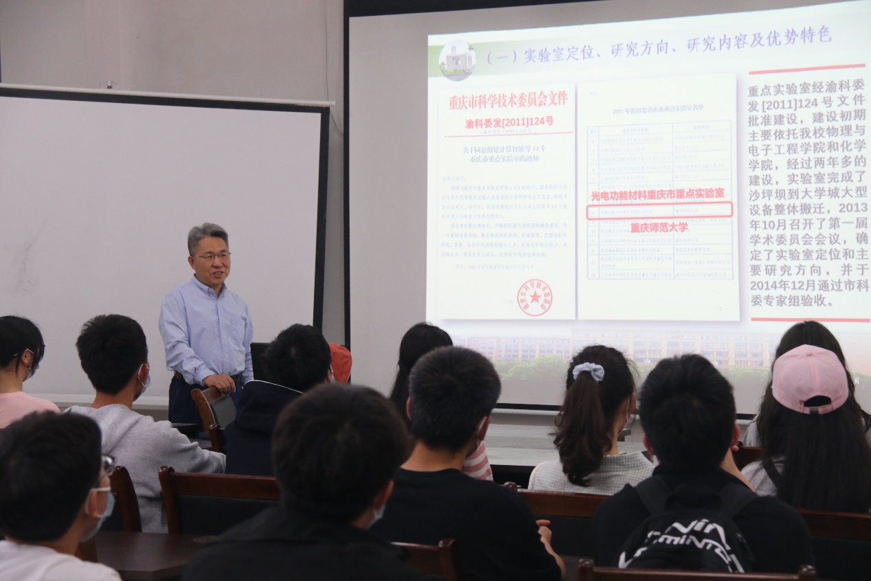 科普活动伊始,余鹏院长致辞谈到:“光电功能材料重庆市重点实验室一贯坚持履行社会责任和义务,面向公众开放,普及科学知识,弘扬科学精神,提高全民科学素养。举办此次实验室科普活动,目的是让同学们体验科学试验奥妙、了解物理前沿知识、培养科研兴趣、激发创新实践能力。最后,他希望同学们不虚此行,并预祝此次活动圆满成功”。随后,由重点实验室副主任苑进社教授为大家介绍了重点实验室概况,包括:实验室定位、研究方向、研究内容及优势特色;研究水平与人才培养;对外合作交流与社会服务等方面。实验室目前的研究方向有:宽带隙半导体材料与器件、有机纳米光电材料与器件和新能源材料与器件。苑教授还表示:“实验室科普活动是培养青少年学习兴趣和激发创新潜能的重要举措,通过眼睛看、耳朵听、动手做帮助同学们找到自己的科研兴趣和明晰的未来发展规划”。
