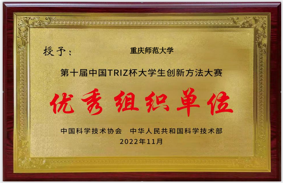 学生刘倩妤、杨宸杰等两个团队获得重庆市一等奖(晋级国家级比赛);冯秀亮、王康宇、任柏年、黄静怡等四个团队获二等奖;赵之瑞、陈桂馨、张佳雯、王莹莹、吴雨航、洪敏等六个团队获三等奖;学校被授予“重庆市triz创新方法比赛优秀组织单位”,杨英和龙兴明两位老师被评为重庆市级比赛优秀指导教师。晋级参与国家级比赛的两支参赛队伍,均获得三等奖,学校被科技部授予“第十届中国triz大学生创新方法大赛”优秀组织单位;杨英老师被评为“第十届中国triz大学生创新方法大赛”优秀联络员。