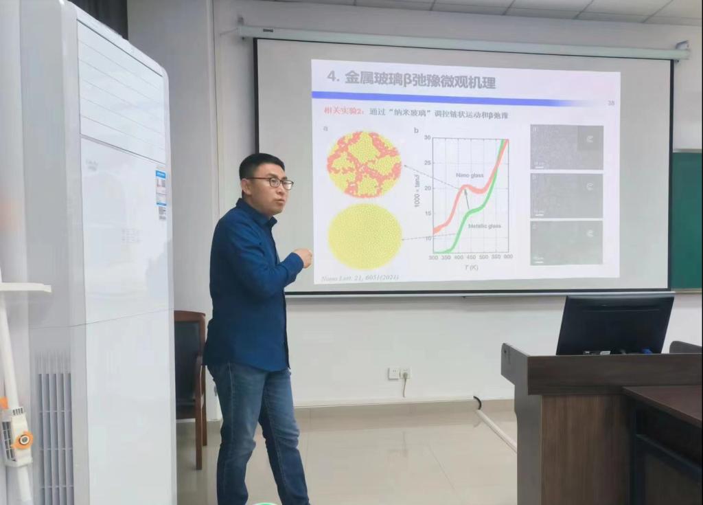 于海滨教授长期从事非晶态物质的结构驰豫研究,2015年入选国家青年人才项目。报告围绕非晶态物质的结构驰豫展开。非晶态物质微观结构长程无序,体系在能量上处于亚稳态;相应的物理、化学和力学等关联性质、特征及结构随时间演化。由于无序结构的复杂性,现有固体物理和材料科学理论、模型和研究范式都无法有效解释和描述其结构及结构与性能关系、新现象,急需科学新理论、新方法和新范式。于海滨教授以非晶态物质的弛豫现象为出发点,探讨“结构-弛豫-性能”关系。通过系统测量弛豫行为,建立了β弛豫与金属玻璃塑性变形机理、相变存储材料相变速率以及赝玻璃转变本质之间的内在联系;澄清了金属玻璃β弛豫的宏观热力学特征和微观原子弛豫运动机理。