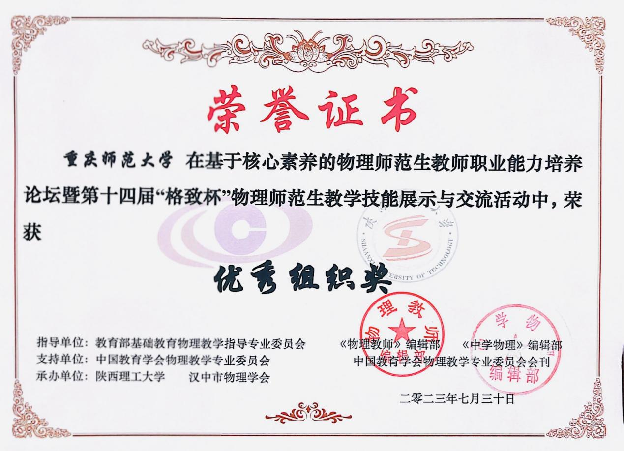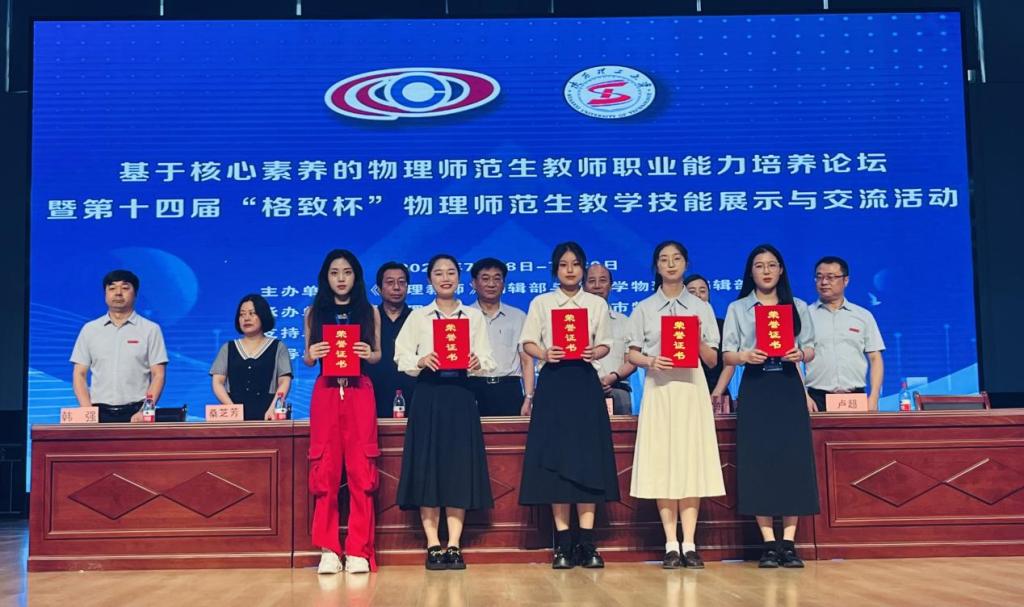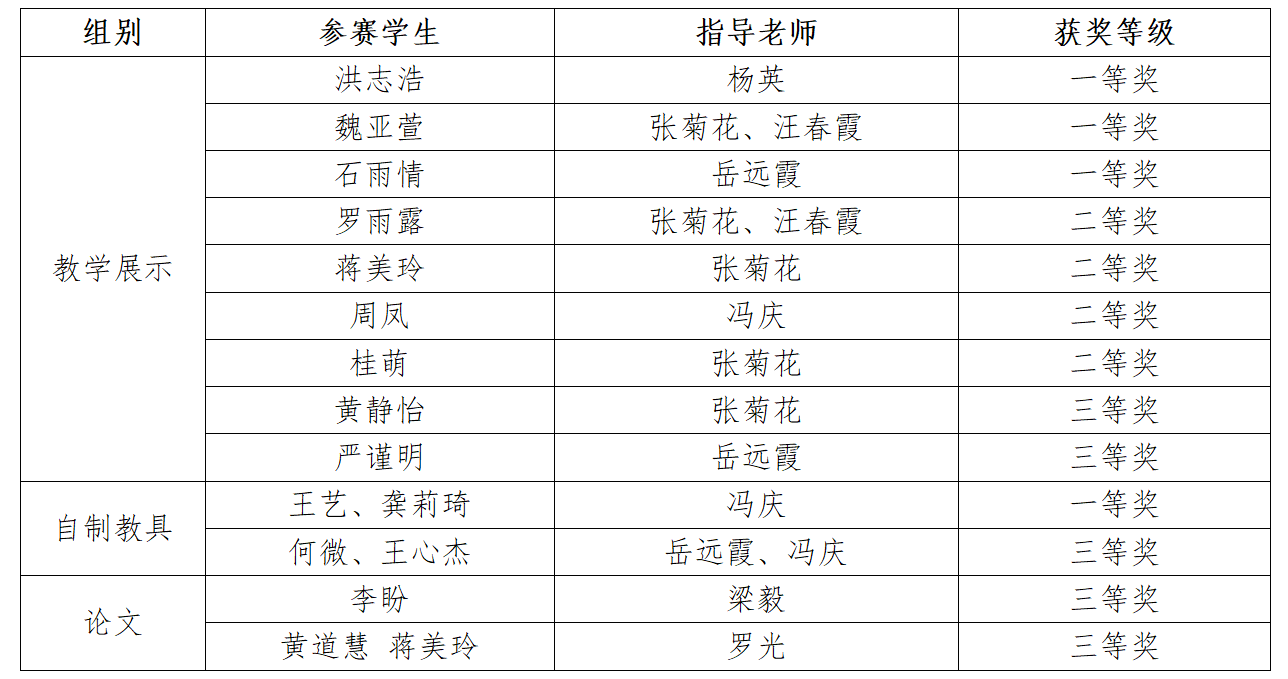 本科生和研究生共有9名同学参加教学展示、2组自制教具展示和2组论文展示。在物理教育学团队的精心指导下,他们取得了一等奖4项、二等奖4项、三等奖5项的好成绩,学院获得优秀组织奖(详见下表)。