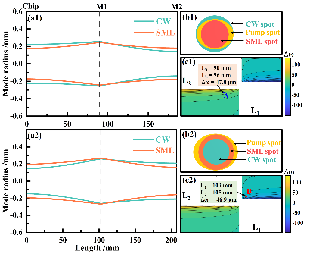 (a1)和(a2)计算了连续波和脉冲激光器在腔中模式尺寸的演化;(b1)和(b2)泵浦光斑、连续光斑和增益芯片上的脉冲激光;(c1)及(c2)SMLVECSEL谐振腔稳定区的工作点;下标1和2对应于实验中采用的两种方法。