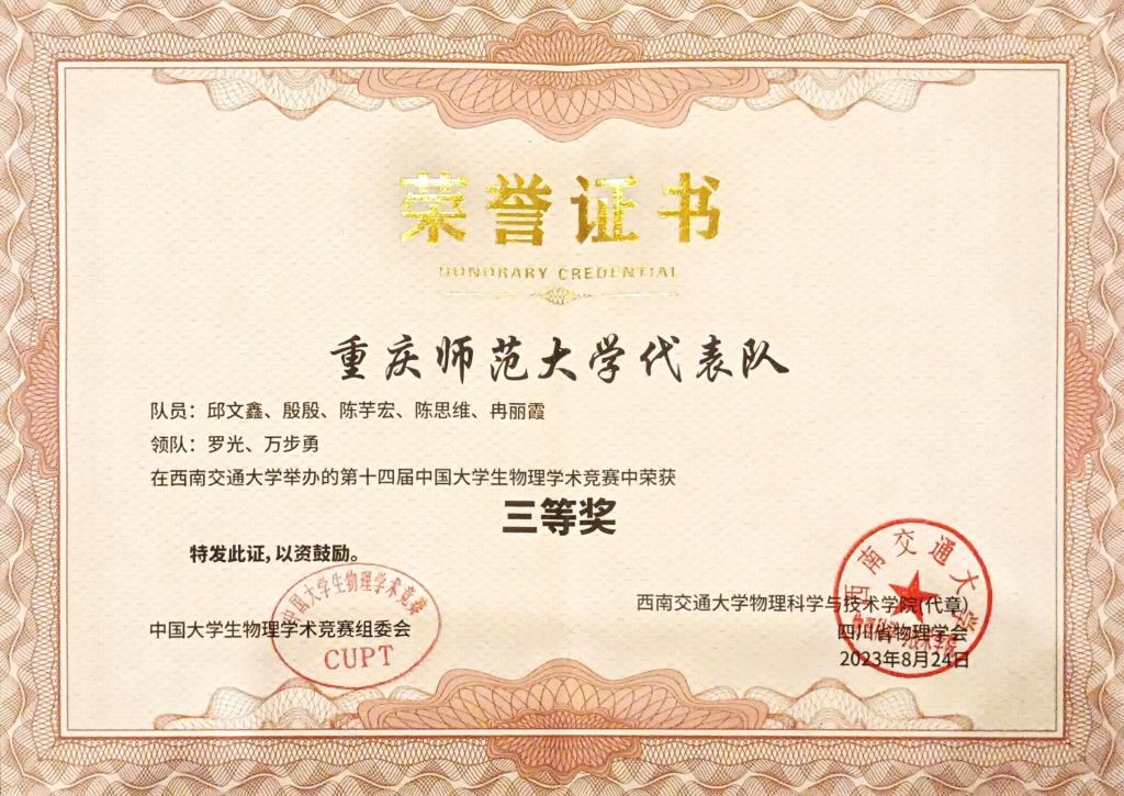 图为:中国大学生物理学术竞赛获得团体三等奖奖状