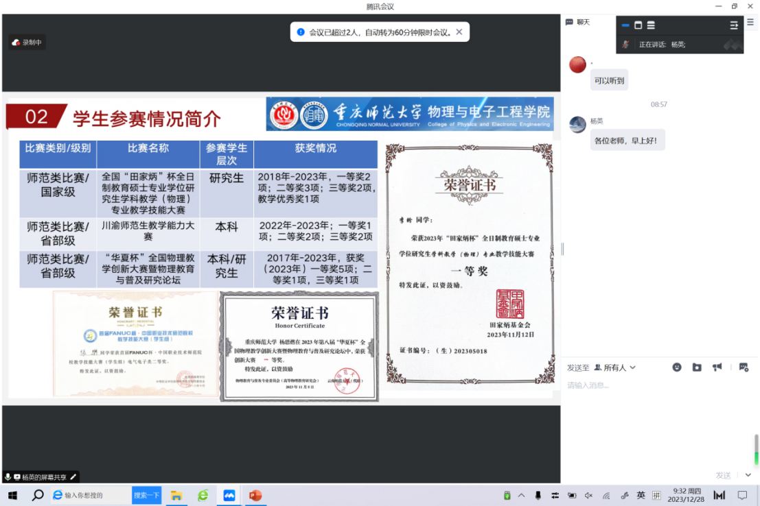 物理教育虚拟教研室杨英老师(沙坪坝人工智能科普基地负责人)以指导学生参加各级各类比赛为主题,结合案例分享指导学生参加比赛获奖的经验和心得。