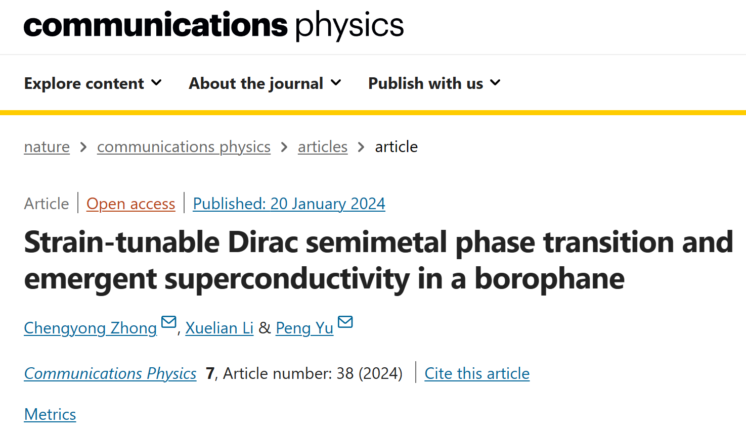近日,奈飞工厂 青年教师钟承勇作为第一作者和通讯作者,余鹏教授作为共同通讯作者,以奈飞工厂 为唯一单位在Nature旗下期刊《Communications Physics》(中科院物理大类一区TOP期刊)上发表题为“Strain-tunable Dirac semimetal phase transition and emergent superconductivity in a borophane”的最新研究成果。