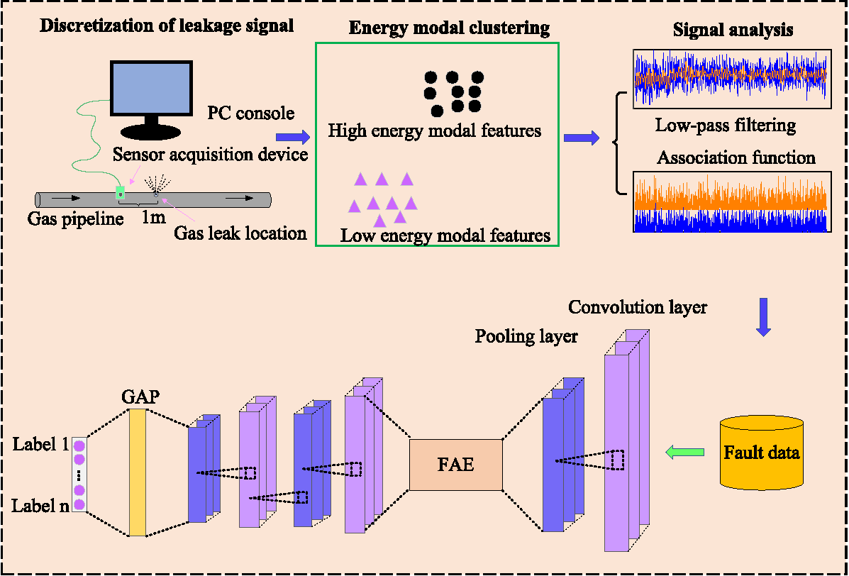 基于声学信号的天然气管道泄漏检测技术存在一些问题,如背景噪声覆盖,缺乏有效特征及样本小导致故障识别率低等。在先前的技术改进研究中通常只研究了其中一个问题,本研究提出了一种整合声学特征处理技术和特征重构的天然气管道泄漏检测模型,共同解决上述问题。该模型由两个组件组成:第一个组件是声学信号的特征处理技术,包括频域向量去噪和时间域关联函数特征增强;第二个组件是具有扩展结构特征编码器(FAE)的一维卷积神经网络,用于特征重构(FAE-1D-CNN)。在声学信号的特征处理阶段,首先通过离散化将由声学传感器收集的信号转换为数字信号,然后利用能量模态函数对数字信号特征进行高/低能量模态聚类。通过向低能量模态特征矩阵添加关联因子来增强特征有效性,同时利用低通滤波方法处理高能量模态特征,消除高频部分的背景噪声干扰。在故障特征提取阶段,引入特征编码器(FAE)在1D-CNN网络中,旨在提取有效的故障特征并进行局部空间特征的二次重构,解决了小样本泄漏信号中有效故障特征较少的问题。采用全局平均池化层替代全连接层,并使用Softmax函数作为故障识别分类器。该方法在GPLA-12数据集上进行了评估,故障识别准确率达到 95.17%。与其他竞争方法相比,本文方法表现出最佳性能,具有广泛的应用前景。
