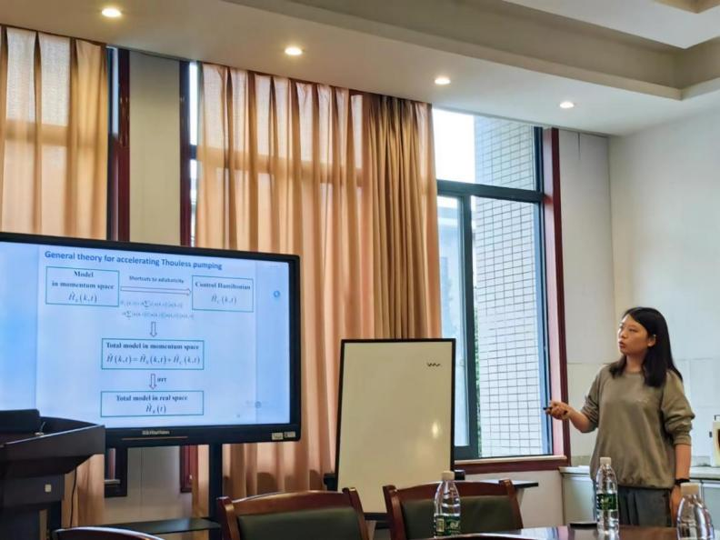 柳文洁博士在报告中指出,为了实现Thouless泵浦满足绝热演化,她的团队提出使用绝热捷径技术来加速Thouless泵浦。这种快速拓扑泵浦方法具有显著的优势,它既可以将泵浦时间大幅缩短,比传统方法快11个数量级,也可以有效地抑制波包扩散,进一步提高其效率,为实现超越绝热限制的快速拓扑泵浦提供了一种实用且有效的方法。