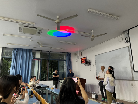 屈川老师从教期间一直致力于物理创新实验开发和研究,制作大型特斯拉线圈、范德格拉夫起电机、轨道电磁炮、雅各布天体等各类实验教具近百件,开发设计“实验让课堂更有温度”系列课程,新颖的教学方式先后被新华社、人民日报等媒体报道。屈老师在讲座中分享了物理实验教具制作的经验,并将自制的部分实验教具带到讲座现场为物电学子进行展示,音乐特斯拉线圈、电磁炮实验、反冲小车实验、自制汽笛、安全用电实验……新颖的实验设计和意想不到的实验结果吸引了众多同学的目光,讲座现场惊叹声不断。