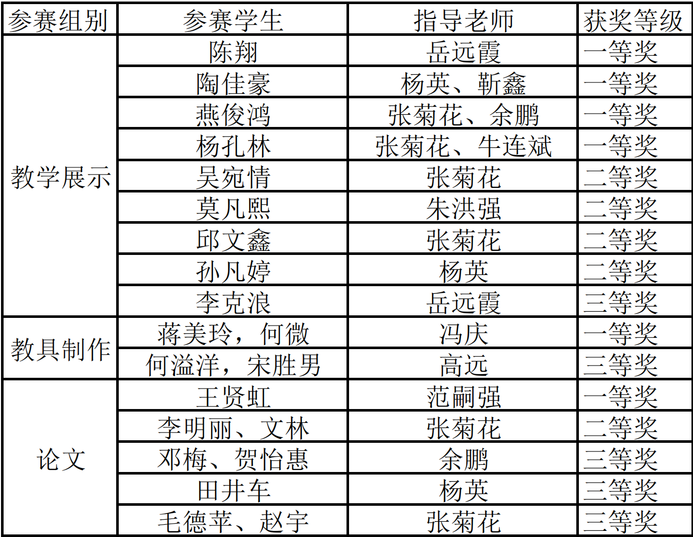 表一:物电学子第十五届“格致杯”全国物理师范生教学技能展评活动获奖名单