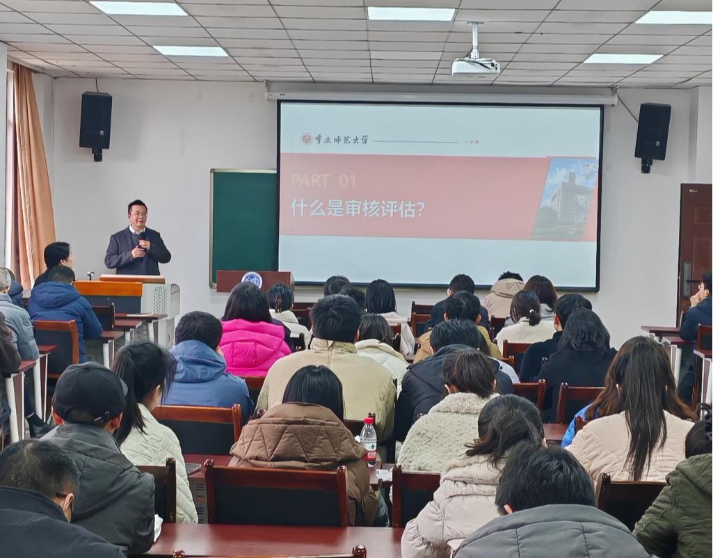 在集贤楼511会议室召开本科教育教学审核评估工作专题培训会,会议由院长余鹏主持,副院长罗海军主讲,学院全体教职工参加。