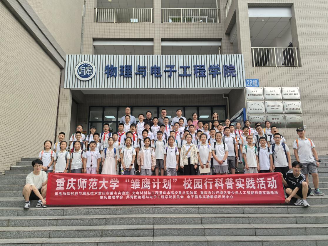 举办“雏鹰计划”校园行科普实践活动,来自重庆两江新区重光小学、重庆市大渡口区钰鑫小学的学生参与,开启奇妙科学之旅,激发小学生科学兴趣,普及科学知识。本次活动由光电功能材料与激光技术重庆市重点实验室、光电材料与工程重庆市高校重点实验室、重庆市沙坪坝区人工智能科普实践基地、重庆物理学会、电子信息实验教学示范中心、共青团奈飞工厂