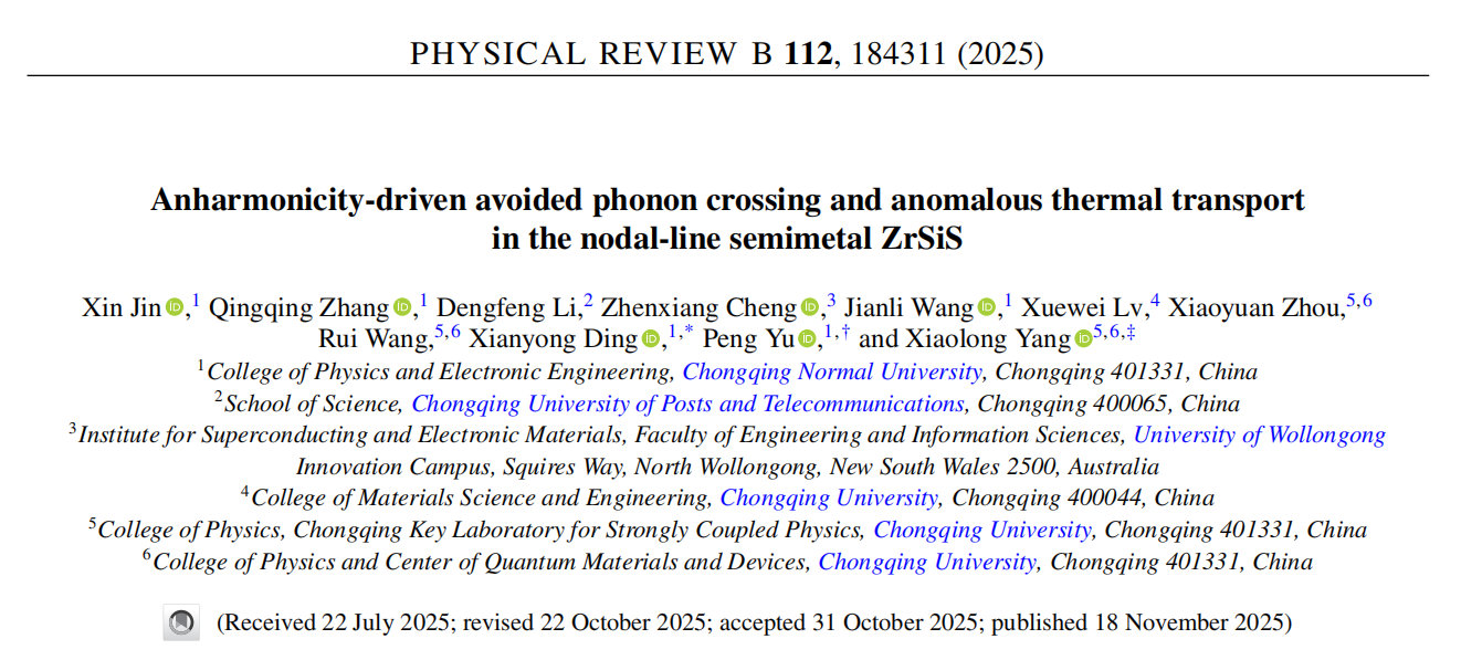 在国际期刊《Physical Review B》(物理类自然指数期刊)上发表题为“Anharmonicity-driven avoided phonon crossing and anomalous thermal transport in the nodal-line semimetal ZrSiS”的研究论文。论文由奈飞工厂