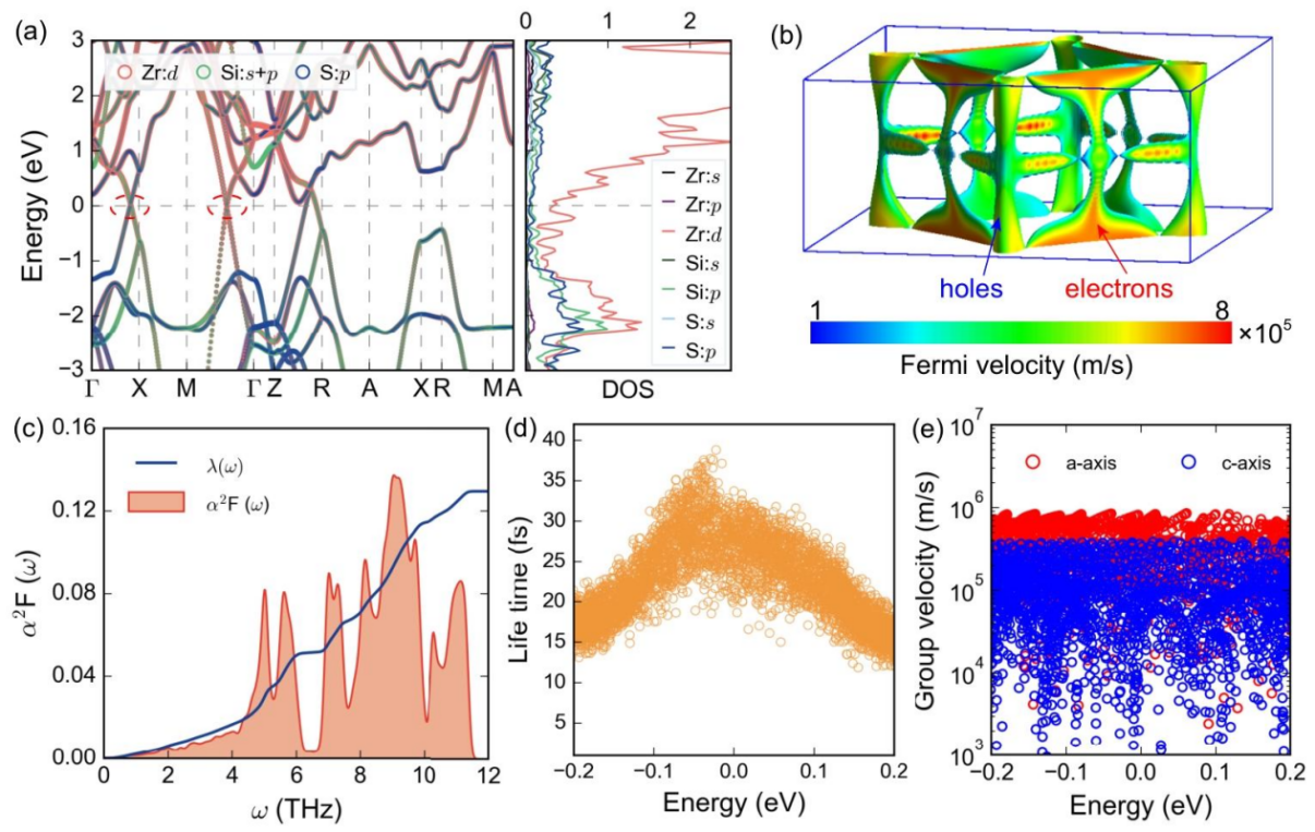 标记狄拉克点的投影电子能带结构及态密度、带有费米速度投影的费米面、Eliashberg谱函数与电子-声子耦合强度、声子限制载流子寿命及载流子沿a轴与c轴的群速度