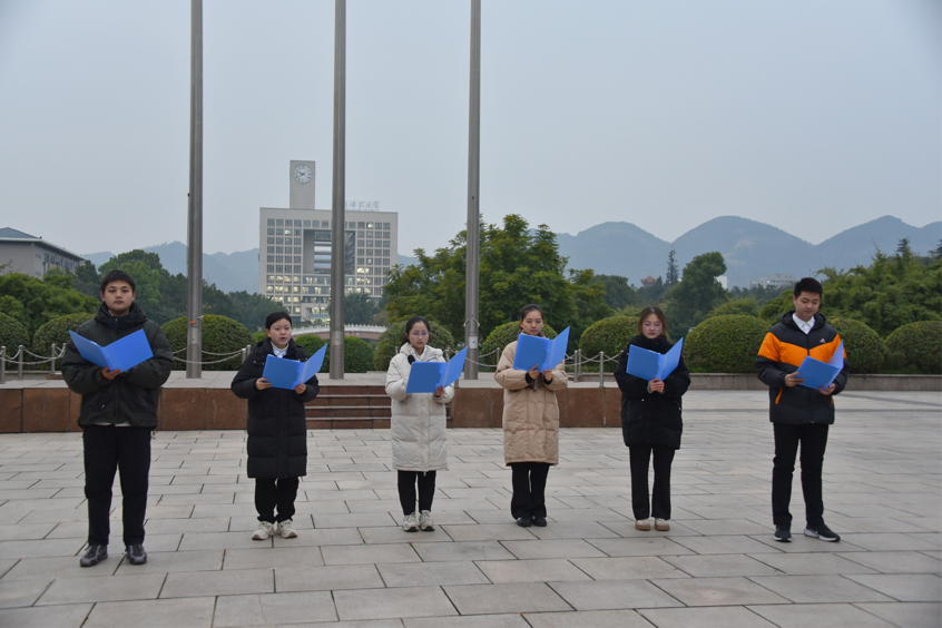在校前广场隆重举行“国旗飘扬,青春向党”主题教育活动。学院党政领导班子成员、教职工代表、团委学生会骨干及2025级全体同学共同参与。活动由学院党委副书记曾艳主持。