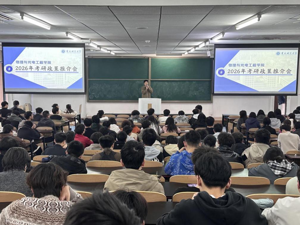 此次考研政策推介会的开展,让学生全面且深入地了解了学院研究生招生的专业设置、考试科目、录取政策、培养体系及发展前景,为学生科学制定考研计划、合理选择报考方向提供了重要参考依据。后续,物理与光电工程学院将持续为学生提供考研专项指导与帮扶服务,助力学子找准自身定位、专业选择,同时为学院学科建设与人才培养工作吸纳更多优质生源。