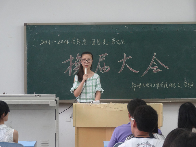 团总·支学生会干部换届大会在弘德楼12406举行,新老两届干部成员在此完成学生工作上的交接仪式。出席本次大会的嘉宾有学院党总支副书记冉久飞、团总支书记李青松以及各年级辅导员,2013届团总支·学生会干部以及2014届新任干部参加大会。换届大会由马良主持。