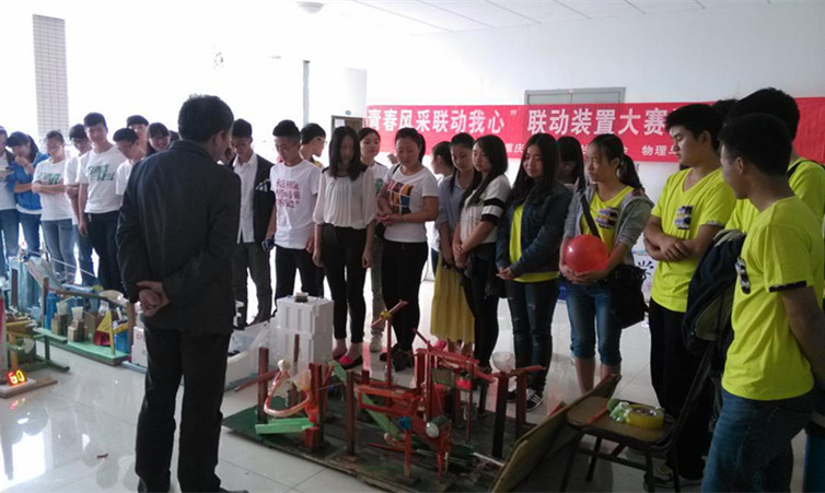 中午13:00,工作人员对比赛现场进行布置;半个小时后,参赛队伍陆续抵达比赛场地,并开始组装、调试各自队伍的参赛装置。14:00点,联动装置大赛正式开始。据了解,赛程分为作品讲解、装置联动、评委打分三个环节,参赛队伍须按照之前的抽签顺序依次进行作品的展示。先是由队长向大家讲解联动装置的原理,然后组员间配合推动装置、让其运行。最后,由评委评分甄选出较为优秀的作品,并对各支参赛队伍的作品进行详细的点评、给予适当的改进意见。