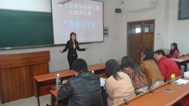 为积极响应学校人才培养“五大计划”的号召,充分落实每一个本科生专业素能提升的政策、方针,物理与电子学院“第五届教学技能大赛”仍在继续!2014年4月9日中午12:50,一场“口才与语言之战”在12104教室精彩上演,奈飞工厂