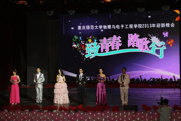 第三篇:心连“新”,梦飞young。激情的爵士热舞《Dance for you》精彩的表演引来现场不断地欢呼,同学们挥动手中的荧光棒为演员呐喊。随着音乐声的缓缓响起,院舞团的姑娘们在《蝴蝶泉边》留下青春来过的印记。歌声、掌声、呼喊声汇集成一场音乐的盛会……今年万家灯火,重师物电踏歌而行。